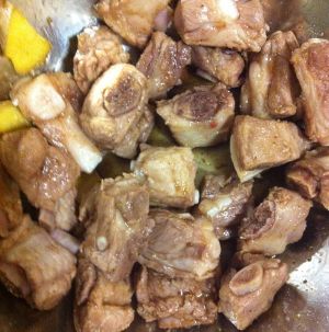 放下排骨爆炒 爆炒时加上啤酒 记住排骨一定要先过一遍水 过水时加入姜和料酒 然后放一遍凉干点