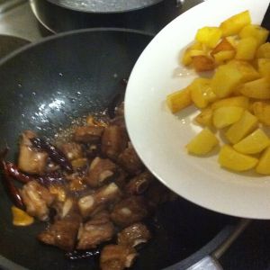 放入切好的土豆,可加适量水炒至土豆变软,加入刚盛出的排骨,翻炒均匀,加热水,1-2块冰糖,没过内容物