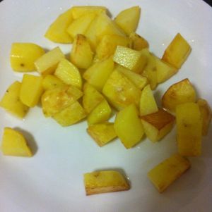 腌排骨的空档,土豆去皮切块,锅中下油,油热下土豆煎炸,待土豆成金黄色,这样炖的时候不容易炖碎