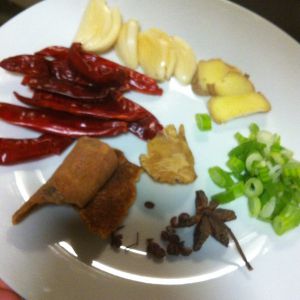 先备好调料:葱切末,蒜拍碎,姜切片,花椒10粒,八角一个,桂皮陈皮各一块,另外我加了一块当归(当归的药用价值除了补血消炎抗癌之外,更对肝脏有保护功能,好处不多说自己百度)