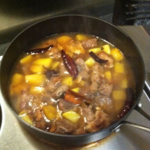 锅烧热放油,下干辣椒,蒜片和茴香,炒香后下排骨翻炒一会儿,再放土豆翻炒。放糖和生抽再次翻炒,加适量水煮熟。