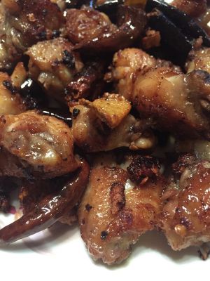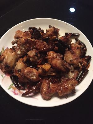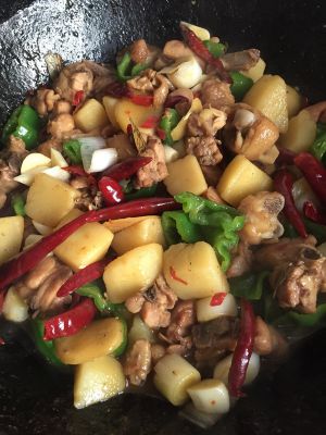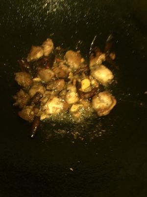锅内放底油,大火烧热,放入大蒜、葱、生姜、泡椒、麻辣酱一起爆香,再放入炸好的鸡肉翻炒,直至鸡肉均匀地沾上酱汁。