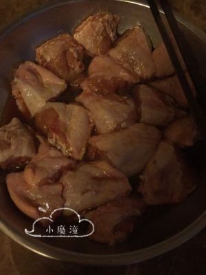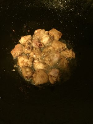 锅内放油,烧至油面起烟时,放入鸡肉,炸至姜黄色后,捞出放置一会。