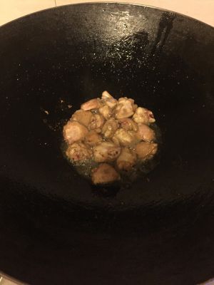 锅内放油,下入葱姜蒜、郫县豆瓣酱,小火煸炒出香味,放入腌好的鸡丁,改大火爆炒。
