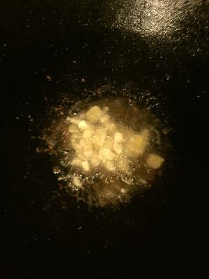 刚刚煎鸡翅的油大火加热后放入姜蒜末炒香