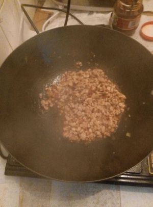锅中热油,放入肉末煸炒