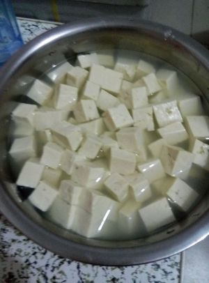 豆腐切成一厘米左右的丁块浸泡在盐水中备用