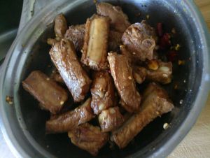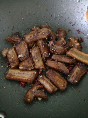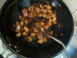 炸了土豆的油,接着用 放入花椒、八角、桂皮、干辣椒翻炒。再放入煮好的排骨,一并翻炒。