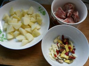 准备材料:2个土豆削皮、切小块。干辣椒、桂皮、八角等洗净备用,姜蒜切好备用。大红辣椒洗净、切好备用。