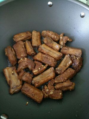 不粘锅热油,放入排骨,拿筷子一个一个往里夹,淹料留着一会用,小火把排骨两面煎黄
