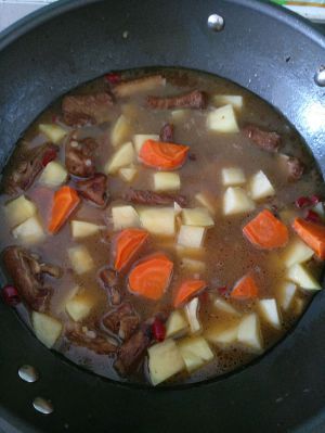 小伙炖了一个小时之后,汤会少了一半,此时加入土豆和胡萝卜快,放入七八颗冰糖和两勺盐,大约6克,继续炖