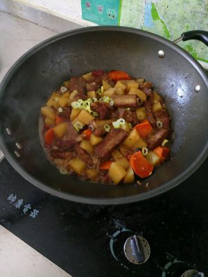 锅内加入适量的油,油热后倒入香料,豆瓣酱炒香,再倒入排骨翻炒,变色后再倒入切好的土豆翻炒几下