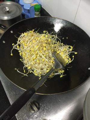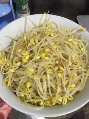 煮锅里倒入适量清水烧开,将豆芽、莴笋、莲菜分别绰水、依次铺入碗底.