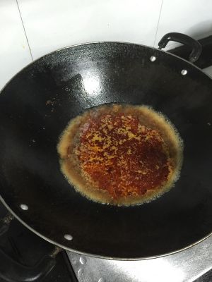 炒锅热油,入郫县豆瓣酱炒出香味,倒入清水烧开.