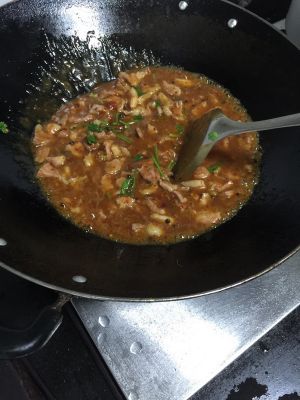起锅时将菜放在下面打底,肉片倒在上面。放入干辣椒末。