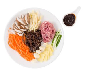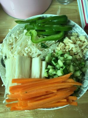 将香菇木耳先泡发,分别将所有配料切丝备用