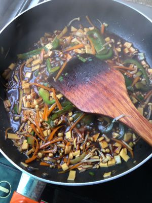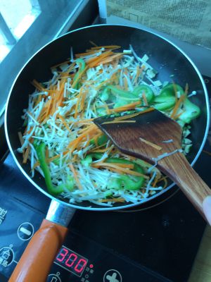 然后你就炒炒炒,闻闻味道对不对,我后又加了盐,醋,糖,十三香,鸡精,觉得不够鱼香味,就加了料,胡萝卜不爱熟,又加了一次水,最后收汁可放淀粉,我没放