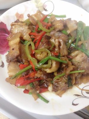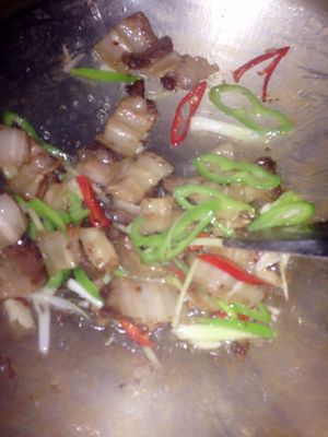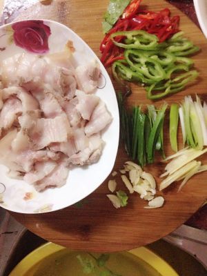 准备材料!五花肉(三层肉煮过开水改刀切薄片)姜丝!蒜片!蒜苗!红辣椒青辣椒!