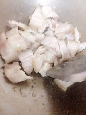 起锅烧热后,倒入五花肉翻炒,待五花肉出油后,沥出多余的油,再把五花肉炒至金黄,加入少许盐。