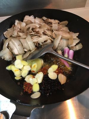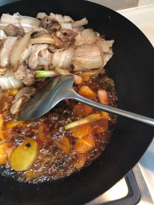 将肉片放入锅中,炒制肉片金黄时加入姜片,豆瓣酱及豆豉,炒出红油,之后加入五香粉,酱油少许,之后继续翻炒。加入各种配菜,继续炒3分钟左右,加入少许白糖调味,之后出锅,装盘。