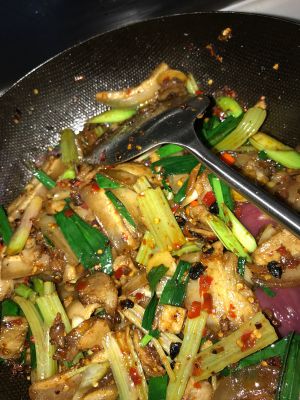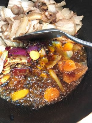 放干豆豉,一勺豆瓣酱,一勺老干妈,白砂糖,姜片蒜片,葱头(可以不放)。