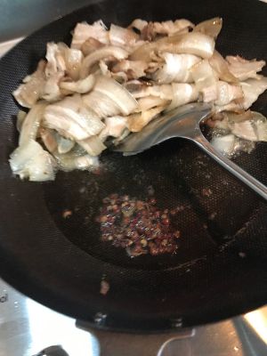 小火爆出油,肉微卷时将肉推到一边,锅也烧一边,也可将肉取出进行下面操作,撒人花椒待花椒开始变色。