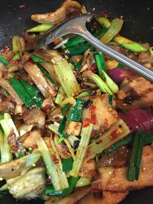 第三步锅里留底油将姜蒜大葱段爆香放入一大勺豆瓣酱,再放入木耳和炸好的肉,放入少许生抽上色,麻辣鲜,鸡精大火翻炒三十秒放入葱花出锅!一道美味的爆炒回锅肉就做好了