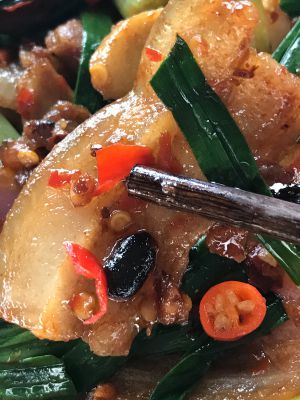 猪肉一定要大块一点,冷水下锅下面垫一钢勺或筷子防止粘锅,姜一大片,大火煮开小火煮二十分钟,筷子能插入皮时夹出沥干放凉,切厚薄合适大片,注意千万不能再沾上水和盐,否则后面爆油时会炸。