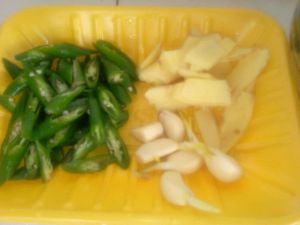 准备好大葱、蒜片、姜片、花椒、干辣椒,辣椒粉。