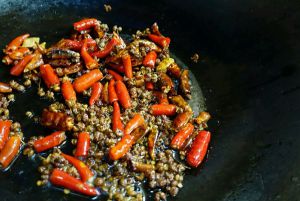 炒至鸡肉成深褐色时加入小米辣和干辣椒段