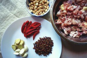 鸡腿两只剔骨切丁(用生抽、料酒、耗油腌制十分钟),朝天椒,花椒,姜和蒜,熟花生米。