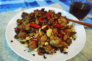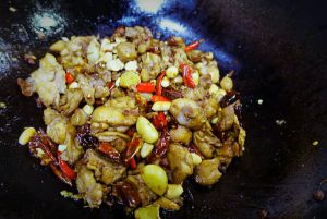 炒好的鸡肉捞出。 另起油锅給朝天椒和花椒过一下油,依据个人吃辣的程度放辣椒,其实川菜的精髓是有辣椒的香气而吃不到口感非常辣。所以我个人花椒放得多,当然,由于炒制的过程中没有加入水,辣味短时间也无法析出,倒是辣椒和花椒椒香扑鼻。