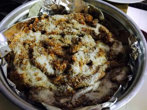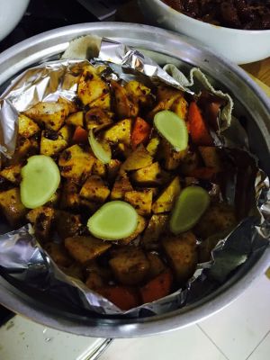 料有点多,就把切的土豆块也拌了一下。在庇子上铺平,我怕有腥味,就又切了姜片,铺了几个在土豆上。我是先拿锡纸铺在了庇子上,以防蒸的漏汤。