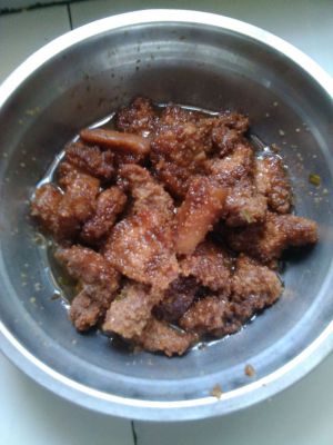 五花肉切好粘上粉放锅里