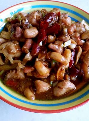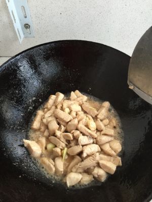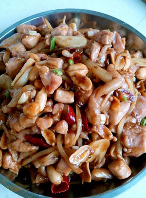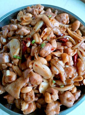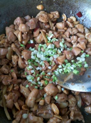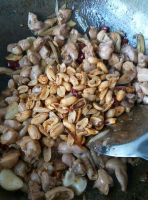 之后加入鸡丁跟花生,鸡肉变色时,用少许蚝油、醋、糖调味。