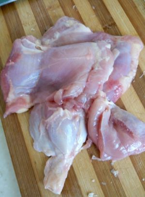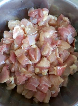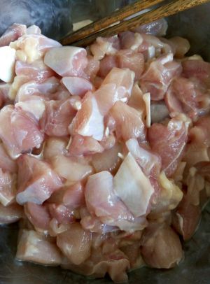 鸡胸肉切丁,放入生抽、盐、料酒与水淀粉拌匀。鸡腿肉也可,不过需去骨。