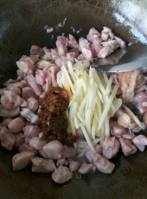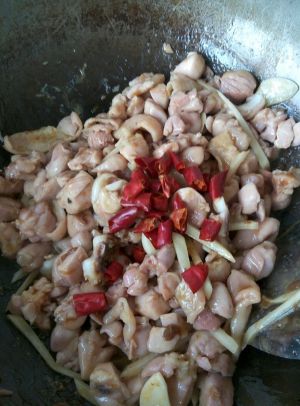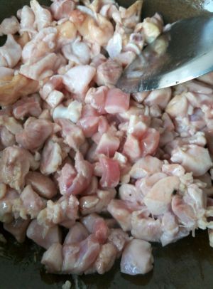 锅里下油,放花椒爆爆香(先爆香了花椒然后去掉花椒.不喜欢吃肉时吃到花椒,所以去掉)倒入鸡丁煎煎会.煎两分钟再把鸡丁划散