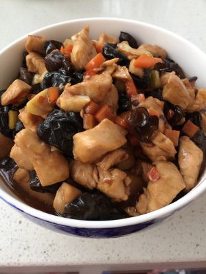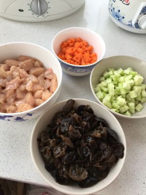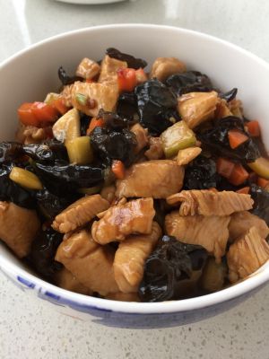 中间加料的忘记拍了,对不起,下次补上,锅热后放冷油炒黄瓜、胡萝卜、木耳翻炒,放鸡丁,炒2分钟,倒入兑好的汁,大火快速翻炒1分钟,出锅!