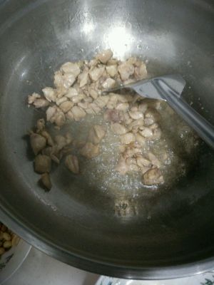 锅里放油,多点,把腌制好的鸡肉入锅翻炒。炒至外表白了盛出。