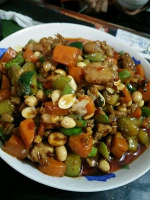 锅内热油放适量花椒粉,先下锅翻炒腌制好的鸡丁至五分熟,随后放入葱姜蒜翻炒出香味,最后放入黄瓜和胡萝卜加适量老抽,鸡精,盐均匀翻炒。
