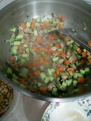 锅里剩下的油接着炒,先放葱、姜、蒜,在放黄瓜、胡萝、鸡肉翻炒。