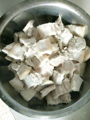 买回来的五花肉洗净,锅里放冷水把肉稍微卤一下。卤水里可以放八角、桂皮、倒点老抽 增色。如图卤好的五花肉。