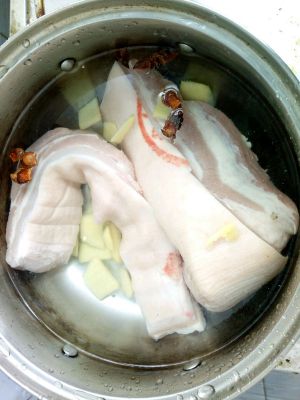 锅内接适量的水(能淹没五花肉即可) 凉水放肉 八角 姜片 大火煮20分钟左右 后边可以转小火煮