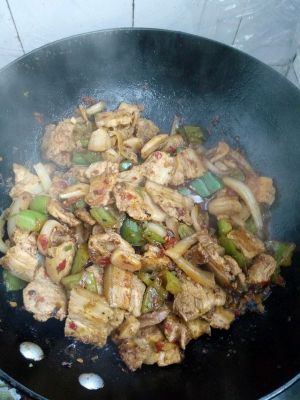 将锅内剩下的油继续烧热放入豆瓣酱炒香后 下切好的葱青红椒和大蒜 翻炒均匀后加少量的水 待水滚起来后下肉 再加少量的水翻炒 加糖 收汁即可
