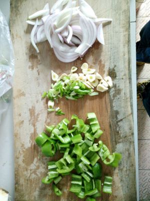 将青红椒切成段状 大蒜切成片状 葱切碎 土豆切成片状备用
