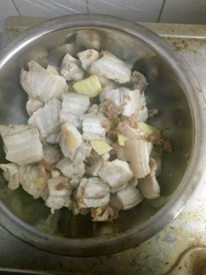 锅内放少量油(一定要少量因为五花肉会出油)油热后下肉和姜片炒至金黄色 控油后捞出备用