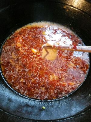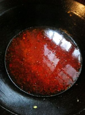 另起锅放油,豆瓣酱,炒热炒出红油,然后加水烧开