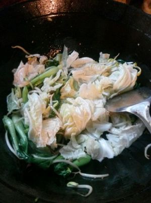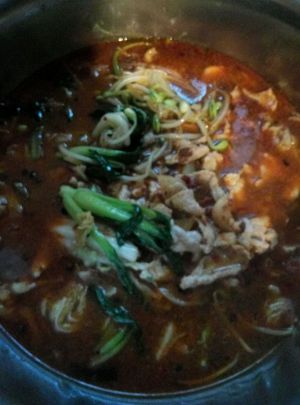 热锅凉油,葱姜蒜末下锅爆香,豆芽菜下去炒微软,圆白菜下去炒两下就行,然后添水盖过菜,加入火锅底料。注意:四川的火锅底料大部分都是辣的,建议北方人选当地不辣的用,既然已经改良了,就不是地道的了,咱怎么好吃怎么来,你说呢?