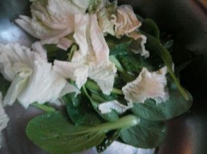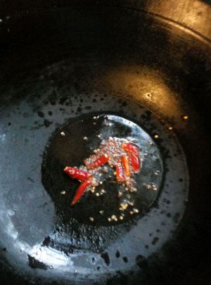 锅里放油 花椒 辣椒,烧热,下青菜。