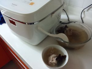 汤煲内加入1500ml左右的开水,用漏勺捞出焯水后的干净排骨块儿放入汤煲开始炖